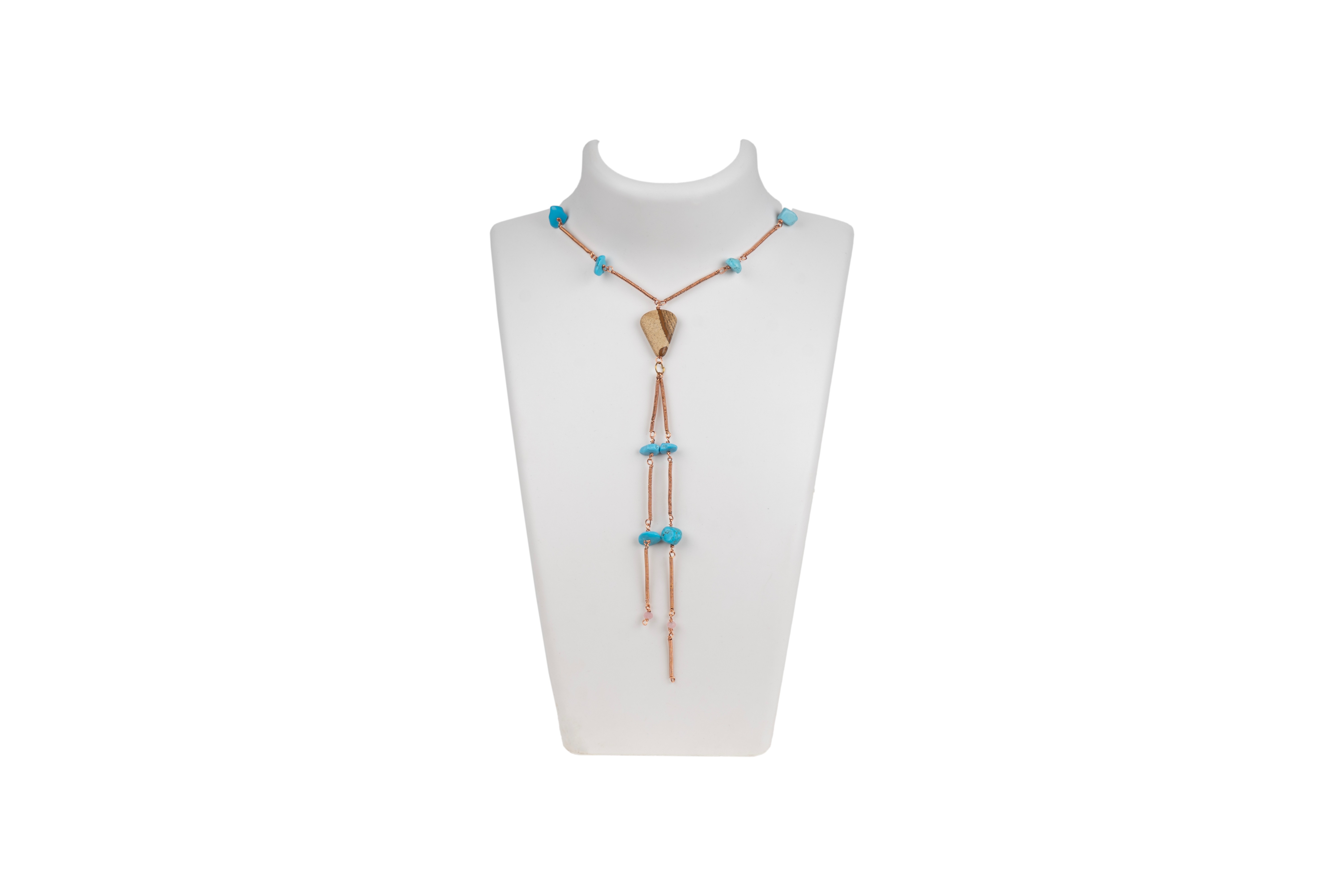 Enhance your outfit with this beautiful medium-sized necklace. Handcrafted with care, it features a delicate chain adorned with uncut turquoise stones wrapped in copper wire, making it one-of-a-kind. This lightweight piece is versatile and perfect for any event.